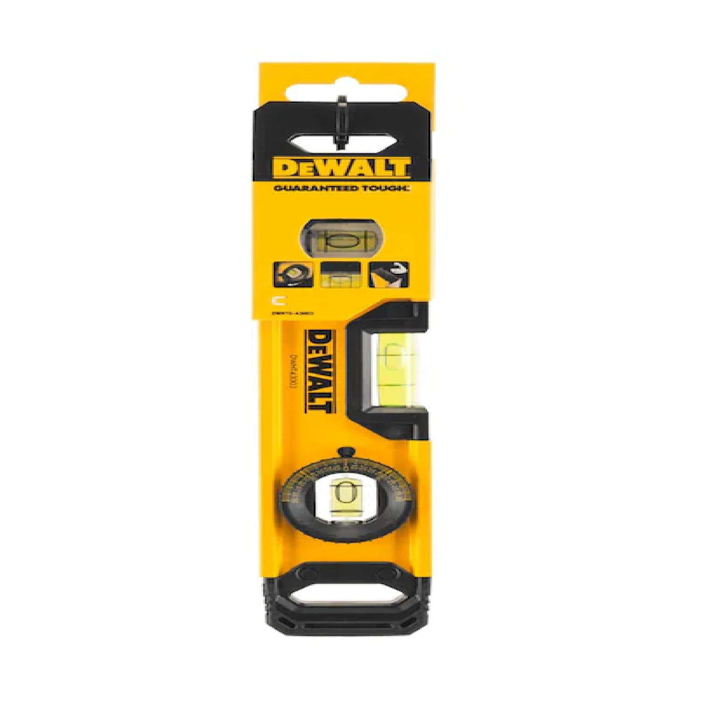La livella DEWALT a sezione rettangolare garantisce precisione e durata grazie alle fiale antichoc e alla struttura in metallo robusta con estremità rivestite in gomma.