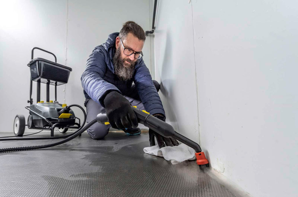Generatore di vapore professionale. Certificato per la rimozione di microbi, batteri e virus incapsualti fino al 99,999%. Serbatoio a carica continua (permette di rabboccare anche durante il lavoro), VapoHydro. SG 4/4 è un pulitore a vapore compatto e robusto che offre una potenza eccezionale e una disinfezione certificata*. L'effetto di pulizia è garantito dalla pressione del vapore di 4 bar. La regolazione continua della quantità di vapore e la funzione VapoHydro (regolazione continua della saturazione del vapore) consentono di adattare perfettamente la macchina a qualsiasi attività di pulizia. Il doppio serbatoio con carica continua garantisce un rapido tempo di riscaldamento e un funzionamento ininterrotto. L'indicatore della temperatura aiuta anche a garantire risultati di pulizia ottimale senza l'uso di prodotti chimici. Ampia dotazione, vano portaoggetti integrato per gli accessori, gancio per il cavo, supprto tubo di aspirazione salvaspazio. (* Secondo prEN 16615, pavimento in PVC, macchina: SG 4/4 (bocchetta per pavimenti con lamelle, 30 cm / sec, pressione max. Vapore, min. VapoHydro), test batterico: Enterococcus hirae ATCC 10541)