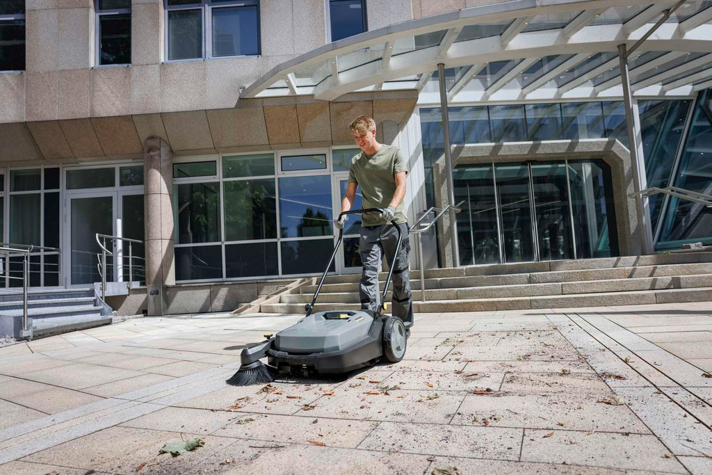 Pulizia interna ed esterna: la spazzatrice manuale KM 70/20 C garantisce risultati ottimali grazie al filtro, al rullo spazzante e alla spazzola laterale. La spazzatrice manuale KM 70/20 C rende le superfici prive di polvere grazie al filtro, al rullo spazzante e alla spazzola laterale - sia all'interno che all'esterno. Le prestazioni di zona è 7 volte superiore che con una scopa. Il rullo di spazzamento può essere regolato in 6 passaggi e, in combinazione con le spazzole laterali a variazione continua, ottiene un risultato di pulizia ottimale su diversi piani. Una maniglia regolabile in altezza e il sistema Home Base per il trasporto di attrezzature aggiuntive come benne e raccoglitori di rifiuti garantiscono un funzionamento ergonomico. Ciò significa che i rifiuti possono essere smaltiti insieme a polvere e sporcizia in un unico passaggio. Quando il lavoro è fatto, il KM 70/20 C 2SB può essere riposto in modo salvaspazio nella sua posizione di parcheggio.